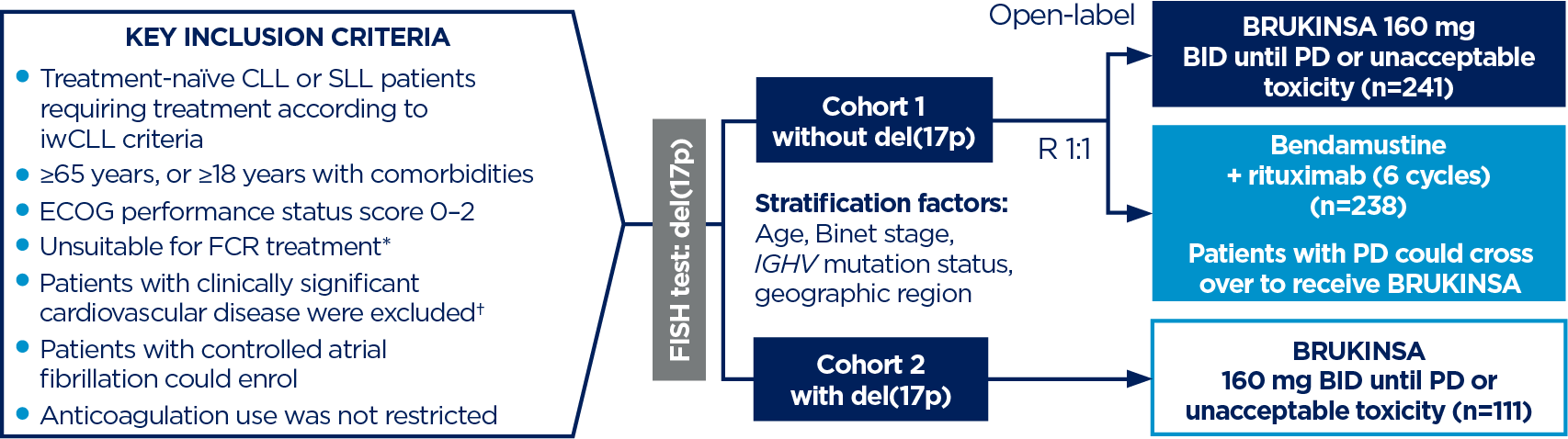 The pivotal SEQUOIA study (NCT03336333) is a multi-centre, randomised, open-label, Phase 3 study comparing BRUKINSA with bendamustine-rituximab (BR) in patients with treatment-naïve CLL or SLL.3